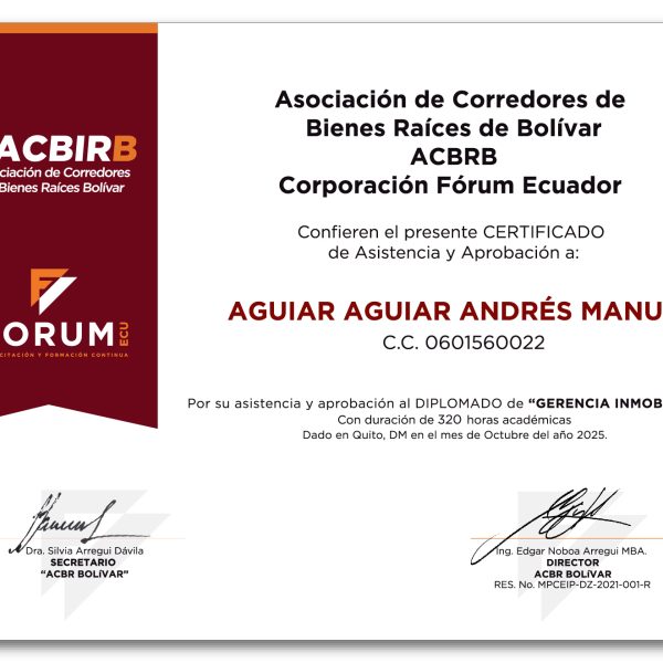 - Certificado de asistencia y aprobación del diplomado en Gerencia Inmobiliaria.